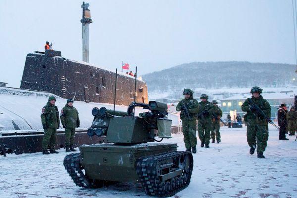 资料图:俄军战斗机器人与步兵一同守卫潜艇基地。