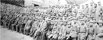 1939年3月,中共中央军委副主席周恩来与新四军军部指战员合影。