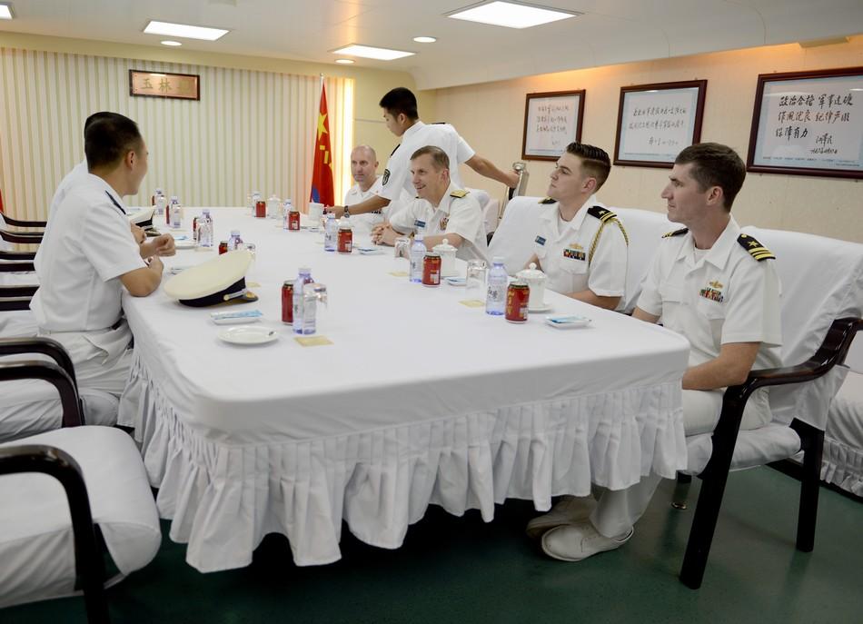 资料图:2015年5月20日,新加坡樟宜海军基地,来自美国海军第73特遣部队司令查理·威廉姆斯少将,登上参加2015新加坡海事防务展的中国海军054A玉林舰参观交流。