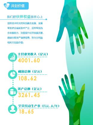《报告》称,兵工集团坚持技术相关的军民融合发展,发展军民结合高新技术产业,提升军民融合发展能力,注重提升经济发展质量,确保国有资产保值增值,努力为利益相关方创造价值。2014年,中国兵器集团资产总额为3261.45亿元,主营业务收入达到4001.60亿元,实现利润108.62亿元。