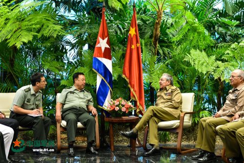 中新网6月16日电 据国防部新闻事务局官方微博“国防部发布”消息,当地时间15日下午,古巴国务委员会主席兼部长会议主席劳尔·卡斯特罗在革命宫会见了正在古巴访问的中央军委副主席范长龙。