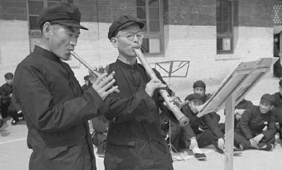 图为在一次文艺表演上,日本战犯伊藤孝一(左)和笠实(右)吹奏立笛和尺八。伊藤孝一曾任察哈尔盟张北保安队司令部指导官,参与制造“万全惨案”。笠实曾任山西省临汾县公署财务辅佐官。