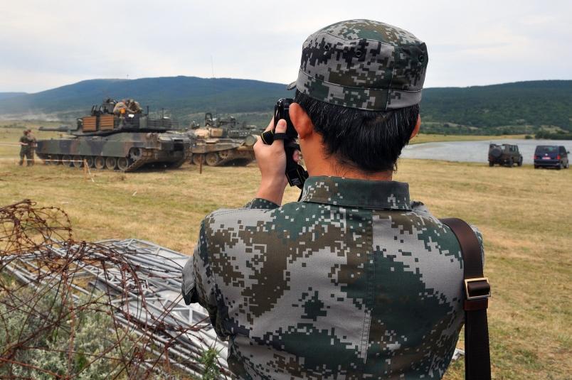 中国军队摄影师拍摄参加演习的美军M1A2主战坦克。