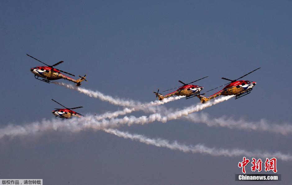 当地时间10月8日,印度空军成立83周年纪念日阅兵活动在加济阿巴德举行。图为印度直升机飞行表演队进行表演。