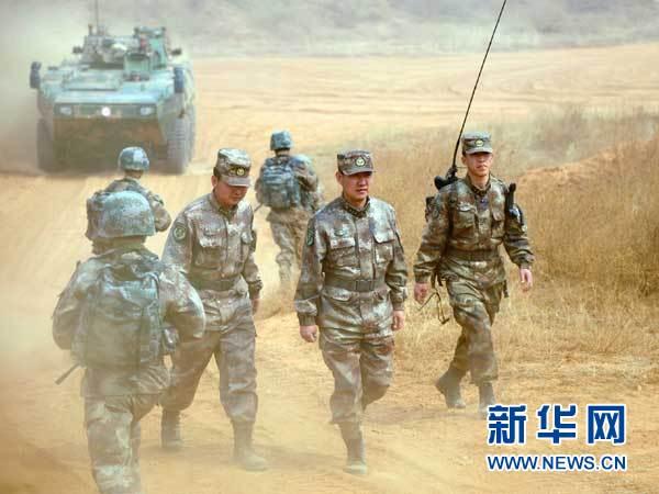 满广志(右二)在该团实兵演练现场查看(2014年3月26日摄)。新华社发(张翼 摄)