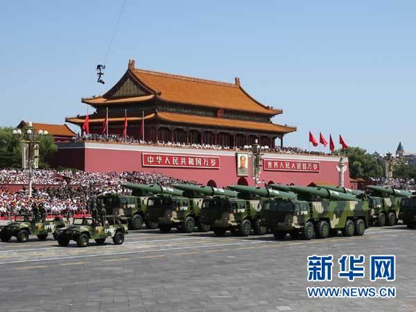 中国人民抗日战争暨世界反法西斯战争胜利70周年纪念大会在北京隆重举行。这是常规导弹第一方队接受检阅(2015年9月3日 摄)。新华社记者李刚摄