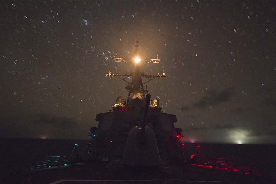 美军导弹驱逐舰“菲茨杰拉德”号(DDG62)在南海航行。