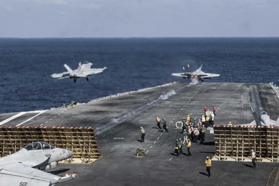 美国海军“里根”号航母战斗群在中国南海附近进行实战训练,频繁起降“超级大黄蜂”舰载战斗机。