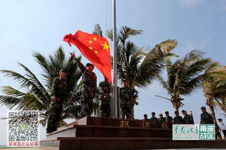 班长赵凯龙在赵述岛上培训民兵升国旗 刘海山 摄