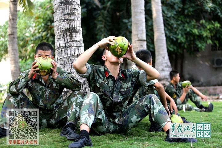 训练后来口清甜的椰汁,是最幸福的,王圣石上等兵把椰子举过头顶,一饮而尽! 蒋波 摄