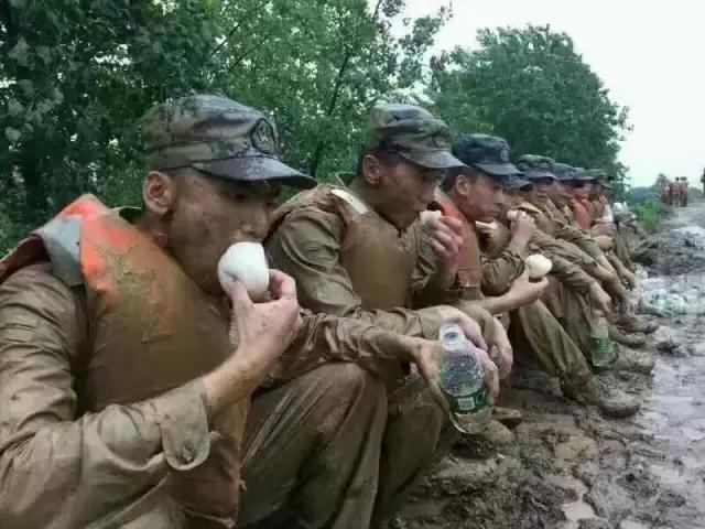 据在现场采访的湖北省军区政治部干事何武涛说,当时太白湖大堤上只有两个班的兵力,结果雨越下越大,管涌比预计的要严峻,一个沙袋没跟上,水就往外溢,哪有时间去吃饭啊?!最后吃的馒头还是当地的一个村民实在看不下去,亲自给他们送过去馒头,战士们为了不辜负她的一番好意才吃的。餐车其实就在附近,伙食是可以的。不信,看这张图,附近一个任务不算太重的官兵,他们吃得并不差。