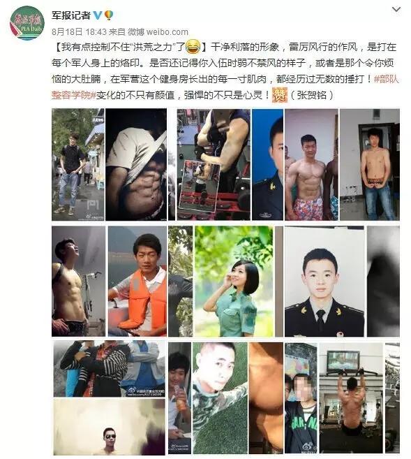 在这样的氛围下,“部队整容学院”话题迎风飞翔,带着网友去看更多普通一兵的军人好样子。这些被“晒”出照片的战友,有着邻家男孩女孩的亲切感,甚至可能是网友的同学和好友,无形中拉近了网友与部队的距离。
