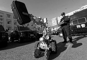 “这是F6A型号的排爆机器人,在工作中可是一名好帮手。”特警总队相关负责人向北京晨报记者介绍,这个机器人是美国制造,可在坡地上前进作业,“像充满毒气的环境或比较危险的地方,就可以让它代替人去初步检查可疑物”。记者看到,机器人的“三只眼睛”分别在抓拿机械手的上方和后方及靠近轮子的前方,它们可以将排爆现场的全方位图像传输到操作板的显示屏上,保证操作者对现场环境全面掌握。