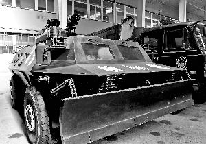 相关负责人介绍,别看这辆车其貌不扬,但它在行动中却是一辆“全地形”好手,在野外处突的环境下非常突出。“我们普通的特警车,很多地形上不去,这时候就需要装甲车出击了,30度到35度的山坡可以很轻松地上去。因为车子有两米多高,排气筒在车顶部位,涉水一米高也没问题”。