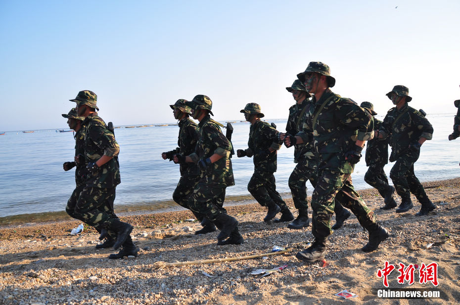 特战队员跑步前往海上科目训练点。陈海峰 摄