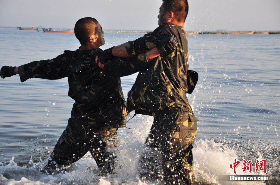 特战队员进行海上擒拿格斗训练。陈海峰 摄