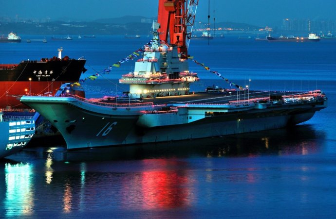 网友拍我航母平台“辽宁舰”节日期间霓虹灯闪亮装点海湾