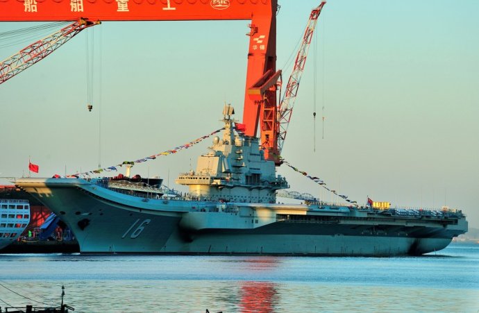 “辽宁舰”节日期间霓虹灯闪亮装点海湾