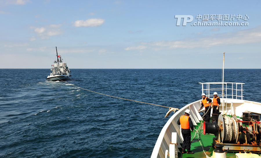 10月19日,中国海军836拖船为受损的中国渔政船只实施拖带作业。