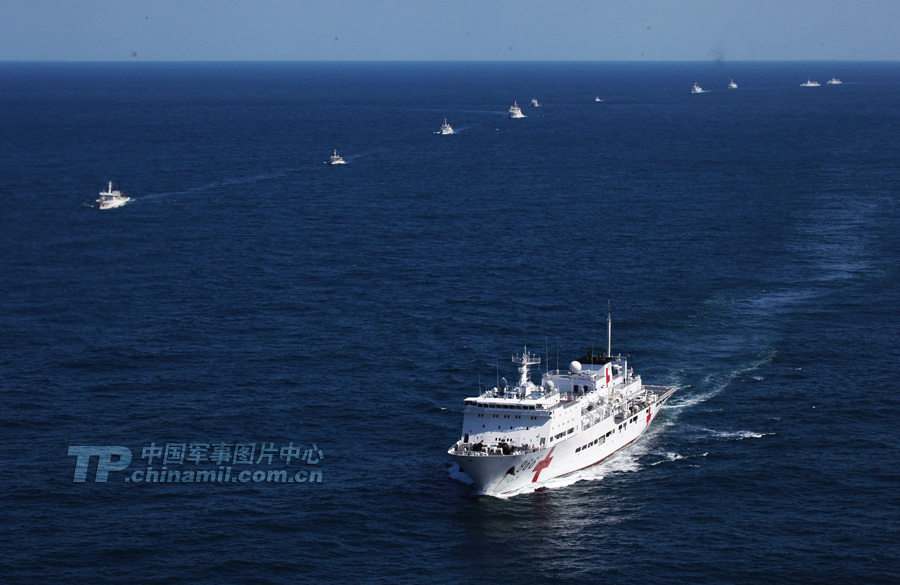 海上联合维权执法演习舰艇编队东海舰队拖船拖带受损地方执法船只。