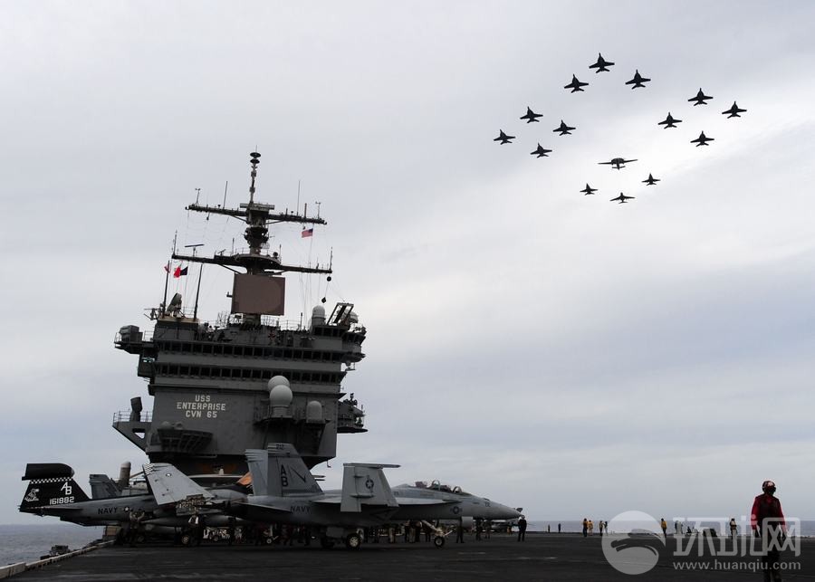 企业号航母所搭载第1舰载机联队的多架战机组成编队从航母上空飞过