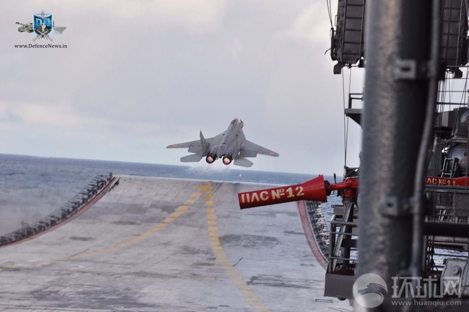从甲板上拍摄到的舰载机在维克拉马蒂亚号上起飞的场景