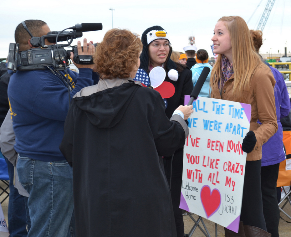 11月4日,企业号航母战斗群舰员家属在码头迎接企业号并接受采访