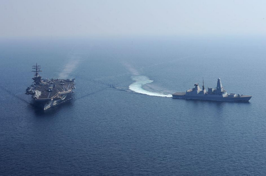 美军CVN69号核航母与英军45级隐身战舰共同执勤