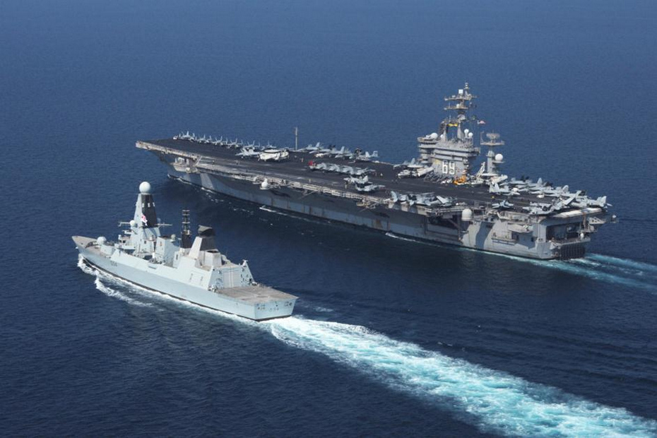 美军CVN69号核航母与英军45级隐身战舰共同执勤