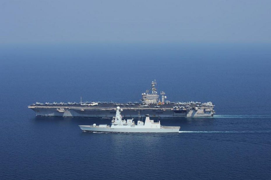 美军CVN69号核航母与英军45级隐身战舰共同执勤