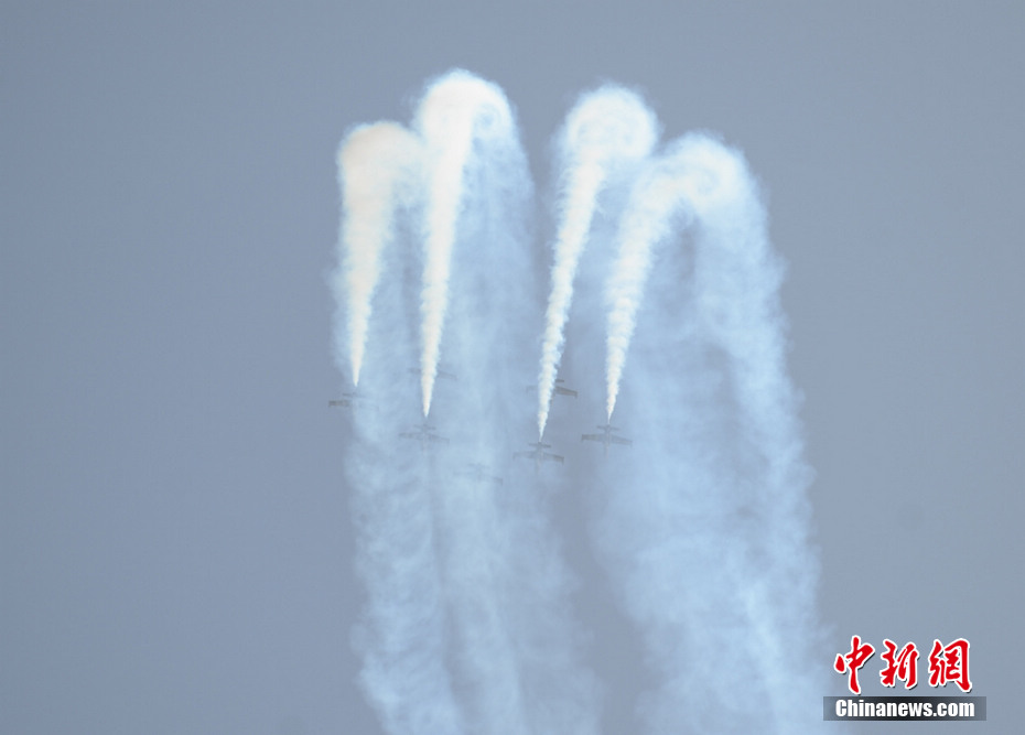 11月11日下午,“百年灵”喷气机特技飞行队在珠海上空进行了精彩飞行表演。陈海峰 摄