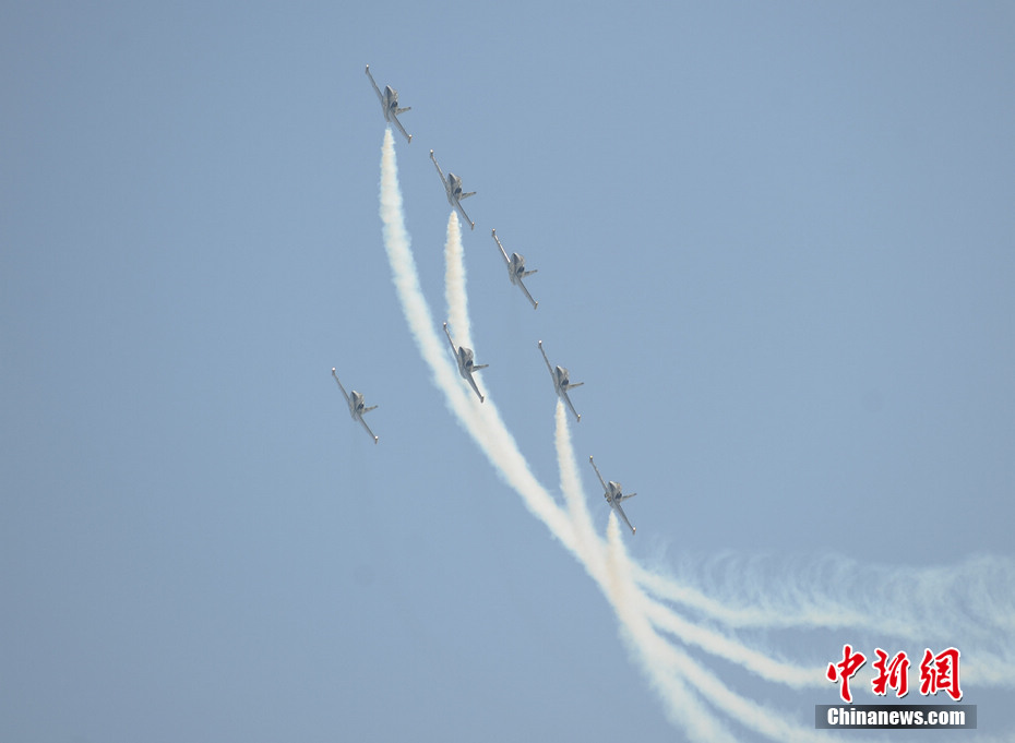 11月11日下午,“百年灵”喷气机特技飞行队在珠海上空进行了精彩飞行表演。陈海峰 摄