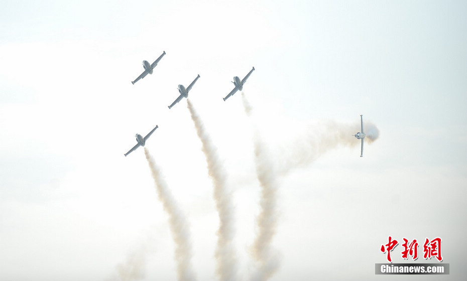11月11日下午,“百年灵”喷气机特技飞行队在珠海上空进行了精彩飞行表演。陈海峰 摄