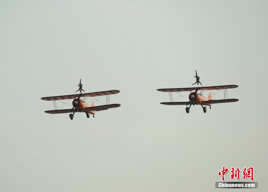 百年灵队表演机翼行走:美女“空中漫步”