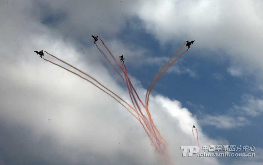 5机拉烟向上开花。解放军报记者 乔天富 摄