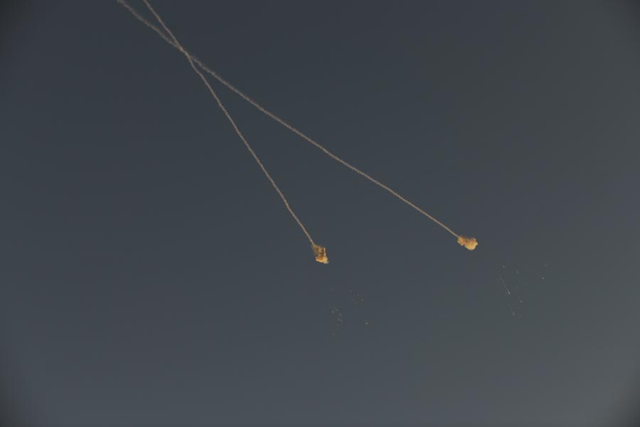 11月15日,加沙地带发射的两枚火箭在以色列南部城镇斯代罗特上空被“铁穹”发射的导弹(带轨迹者)拦截。据加沙地带医疗部门消息,以色列战机15日继续轰炸加沙地带多个目标,造成7名巴勒斯坦人死亡,数十人受伤。巴以冲突升级进入第二天,截至目前共造成15名巴勒斯坦人死亡,超过150人受伤,另有3名以色列人死亡。新华社记者尹栋逊摄