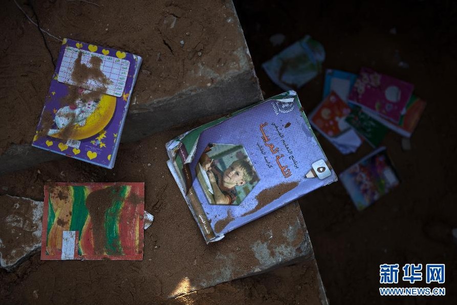 11月20日,在加沙城,被以军轰炸后的废墟上散落着孩子们学习用书。