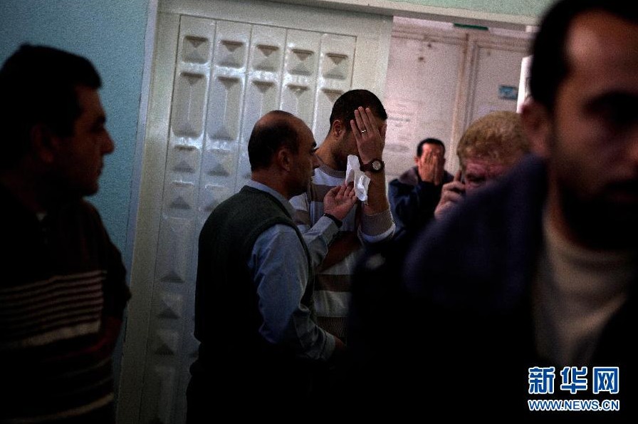 11月20日,在加沙城的阿德万医院,一名巴勒斯坦人给另外一名失去亲人的男子递去纸巾擦拭眼泪。