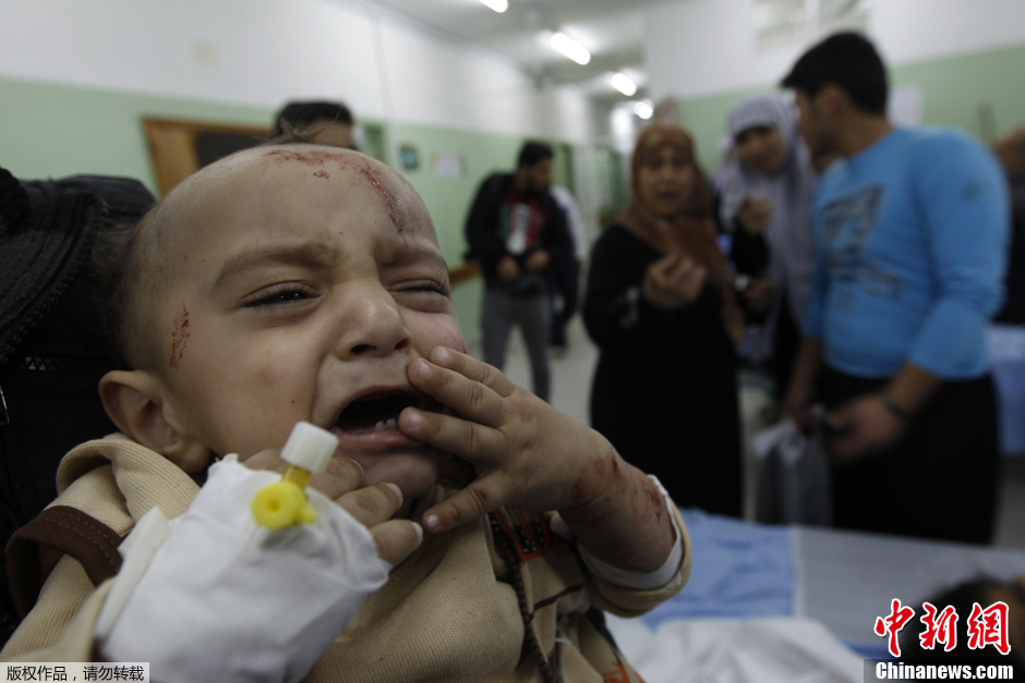 2012年11月20日,以色列与加沙之间的冲突进入第七天。据巴勒斯坦方面统计,在过去的几天里,双方的冲突共造成100名巴勒斯坦人死亡,其中不少是儿童。图为2012年11月17日,加沙,一名在空袭中受伤的儿童在医院外大哭。
