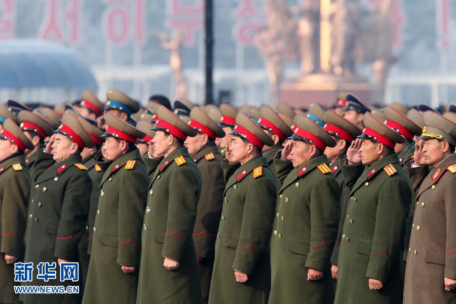 12月17日,在朝鲜首都平壤举行的锦绣山太阳宫开放仪式上,朝鲜人民军将领向金正恩敬礼。朝鲜当日在平壤锦绣山太阳宫门前广场举行了锦绣山太阳宫开放仪式。朝鲜最高领导人金正恩和夫人李雪主以及朝鲜党政军领导人和各界群众代表、海外侨胞出席。朝鲜今年2月宣布将安放金日成主席遗体的锦绣山纪念宫命名为锦绣山太阳宫,将金正日的遗体一同安放。从17日开始,朝鲜接受民众前往锦绣山太阳宫瞻仰金正日遗体。新华社记者张利摄
