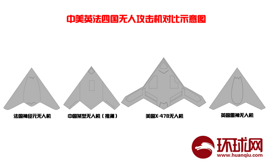 中国隐身无人机与世界主要无人机外形尺寸比较,中国隐身无人机为推测外形图,仅供参考。