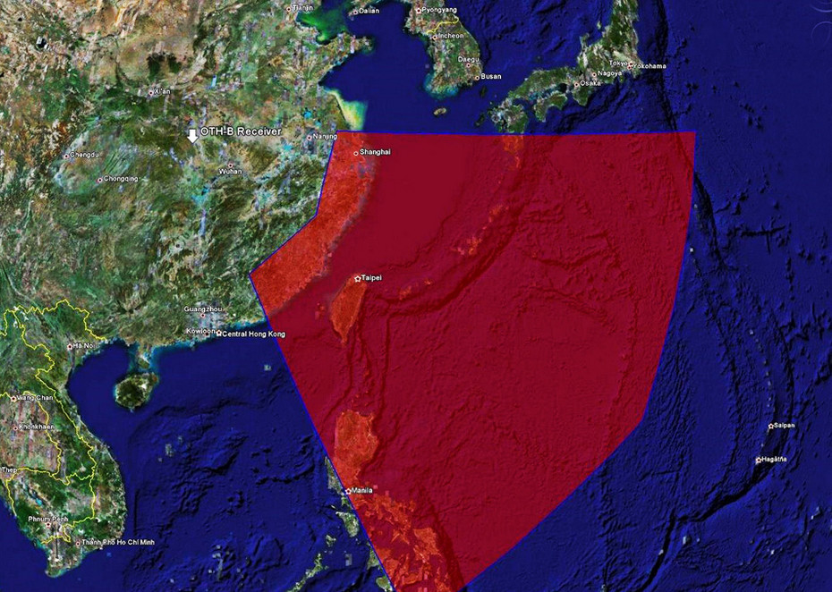 电子侦察卫星与地面监听站都是通过监听无线电信号的方式来进行侦察活动,他们的作用一是侦察敌方雷达的位置和所用频率等性能参数,为战略轰炸机、弹道导弹突防和实施电子干扰提供数据;二是探测敌方军用电台和信号发射设施的位置,以便窃听和破坏;通过对所获情报的分析,还可进一步揭示敌方军队的调动、部署乃至战略意图。(图片为红色区域为,美军认为中国建造的天波雷达最大探测距离)