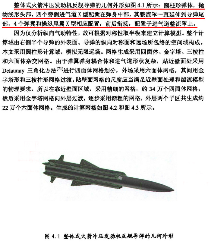 从图中来看,YJ-12采用了四个X形布署的进气道,这样的好处就是大迎角的进气性能较好,也就是说当导弹进行较大迎角飞行的时候,仍旧会有两个进气道保持正常进气,但是它的缺点就是进气道总压恢复受到限制,另外由于弹体开口较多,结构比较复杂,需要进行加强,另外YJ-12的弹翼较小,这样作的可能是减少导弹的飞行阻力,导弹的速度越快,弹身对于升力的贡献越大,但是总体来讲,超音速反舰导弹的升阻比普遍不高,一般在亚音速导弹的五分之一左右。(图片为网上公布的中国鹰击-12反舰导弹图片)