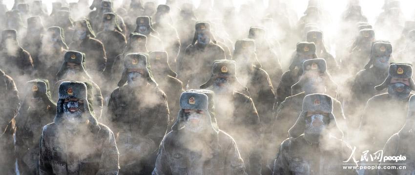 沈阳军区某部边防团新战士正在参加集训。寒冷空旷的训练场上,喊声震天,热气升腾,这些新兵要在这样的冰雪环境中摸爬滚打3个月,锤炼意志,重塑养成,完成从普通青年到合格军人的角色转变。人民日报记者 雷声摄