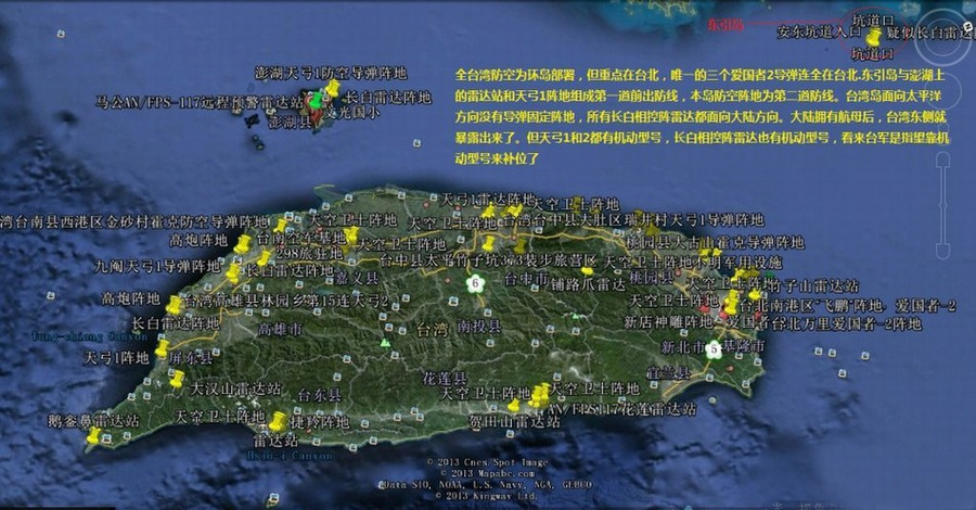 近日,有网友使用谷歌卫星视图对中国台湾进行了分析,并分析出台湾防空部队分布情况,甚至连卫星图片中的地面情况都一一进行了分析。(来源:环球网 感谢超大军事 xiangyuanye供图)
