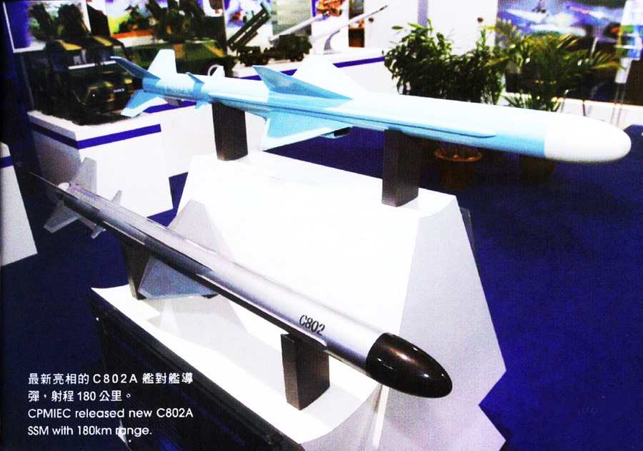 C802反舰导弹武器系统由中国海鹰机电技术研究院研制,又称鹰击-2,是C801导弹的改进型号,但增加了长度,并将C801的固体火箭巡航发动机换装成涡轮喷气式发动机,其无线电测高仪的性能更加完善,战斗部的威力、机动性能、射程等都有所提高。C802导弹有岸舰型、舰舰型和空舰型。C802不仅装备中国海空军,还出口到孟加拉国、巴基斯坦、泰国、印度尼西亚等地,20世纪90年代,伊朗建立了一条C-802反舰导弹组装生产线。C802反舰导弹武器系统可以布置在沿海基地、要塞或岛屿上,用来在较大海域范围内防御、封锁海峡和航道,打击敌方的驱逐舰、护卫舰和登陆艇等舰只,保卫沿海港口、城市和海上交通线。