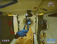 北京时间6月13日13时18分,天宫一号目标飞行器与神舟十号飞船成功实现自动交会对接。16时17分,神舟十号航天员成功开启天宫一号目标飞行器舱门,聂海胜、张晓光、王亚平以漂浮姿态进入天宫一号。图为聂海胜进入天宫一号 秦宪安 摄(来源:新华网)