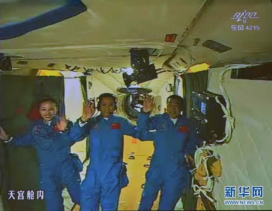 聂海胜、张晓光、王亚平顺利进入天宫一号,向大家招手 秦宪安 摄