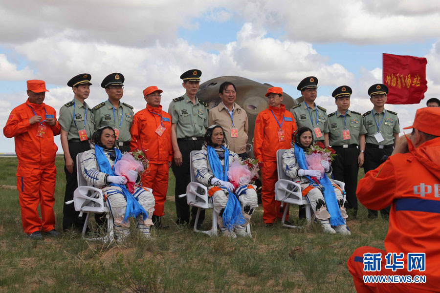 回收现场指挥人员与航天员合影。新华社记者王建民摄