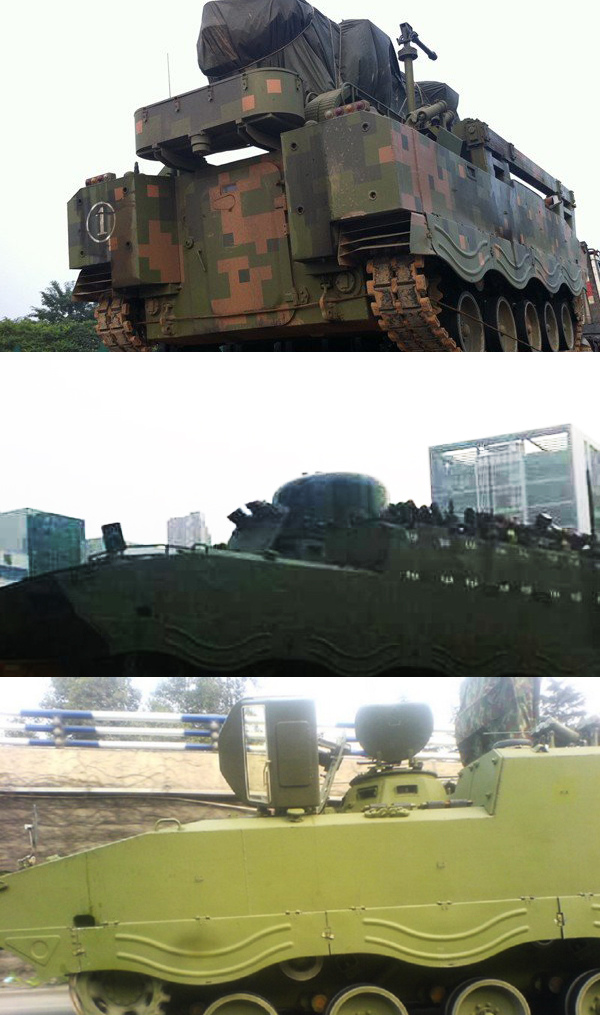 上图为89改综合补给车型,该车型为后勤保障车型,是一种一车多用型补给车辆。是在基型车基础上将后部载员室车体稍加高后改为货舱。货舱内装有6个集装箱,能够根据弹药、油料、器材的配送需要调换不同集装箱。集装箱在舱内分两列纵向放置,由定位座固定。为装卸集装箱,在车体后顶甲板上安装了一台小型液压吊车。该车型将装备于装甲保障分队,在野战条件下伴随坦克分队行动,对坦克实施补给保障。